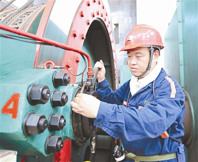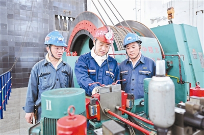 ▲付军在检测副井提升系统绞车液压装置 |