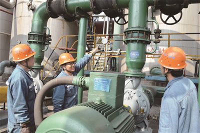 淮北矿业临涣焦化公司化产车间技术工人余海涛(左二)在向工友讲解设备保养维护知识 魏玉东/摄 作者:本报记者 张晓梅 / 吴明 张骅 |
