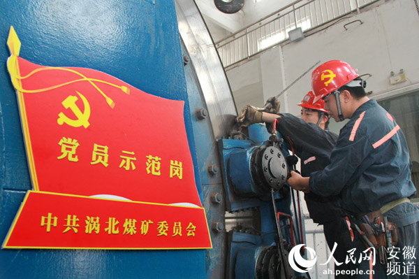 淮北矿业涡北矿一线党员在维护主井绞车电机,擦亮“党员示范岗”名片