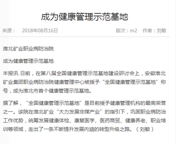 《中国煤炭报》:淮北矿业职业病防治院成为健康管理示范基地