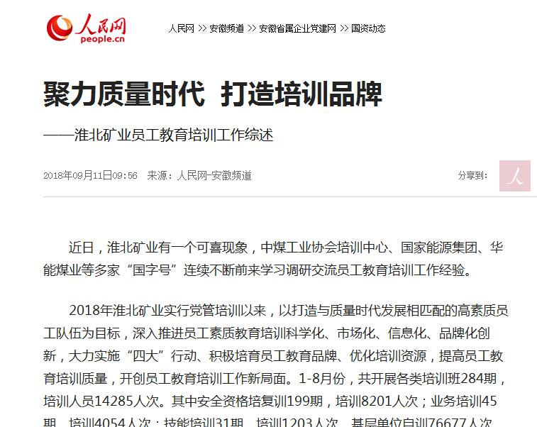 开启“互联网+”模式。开发培训信息化系统,实现员工培训过程管理线上运行,“一期一档”“一人一档”同步生成。通过网站、手机APP智能推送淮北矿业教育培训资源和外部品牌课程,打破培训时间与空间、教师与学员即时对接的局限,解决工学矛盾突出、培训效果不佳、培训管理不到位等突出问题。