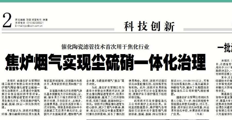 《中国化工报》2版头条:淮北矿业焦炉烟气实现尘硫硝一体化治理