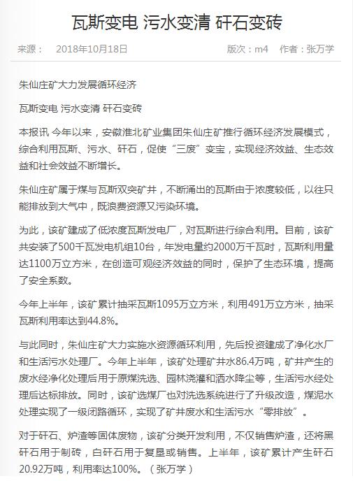 《中国煤炭报》:朱仙庄大力发展循环经济