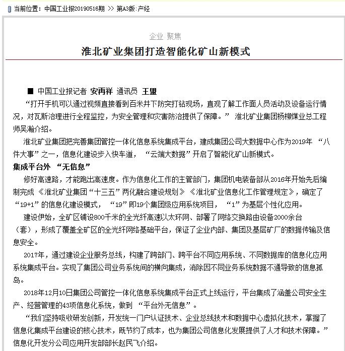 《中国工业报》:淮北矿业集团打造智能化矿山新模式