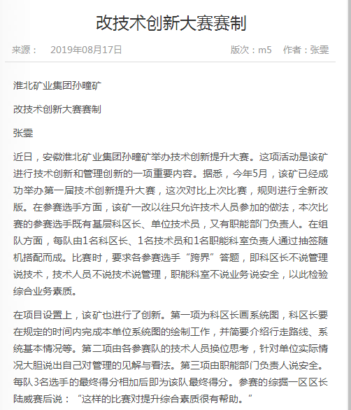 《中国煤炭报》:淮北矿业集团孙疃矿改技术创新大赛赛制