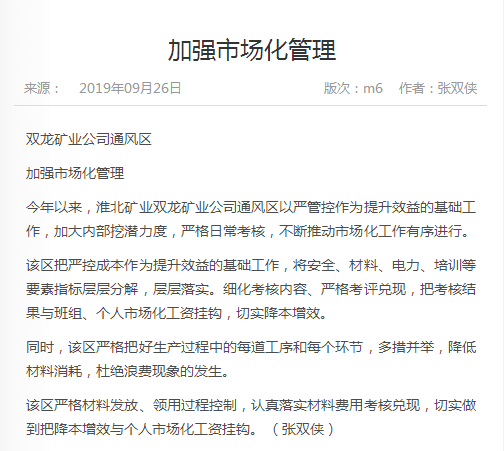 《中国煤炭报》:淮北矿业集团双龙矿业加强市场化管理