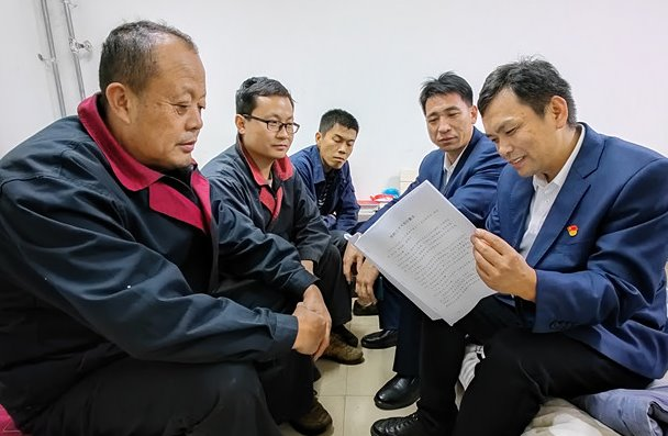 图为近日该矿供销管理科党支部负责人带领支委委员正在组织开展“党的二十大精神”进宿舍活动,引导职工学好用好二十大精神。