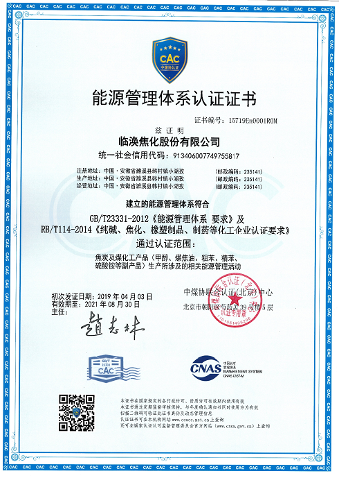 近日,临涣焦化公司成功获得中煤协联认证(北京)中心颁发的《能源管理体系认证证书》,标志着临涣焦化公司能源管理体系的建设取得关键性成果。